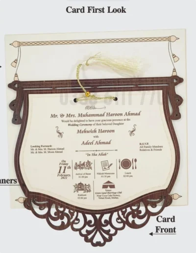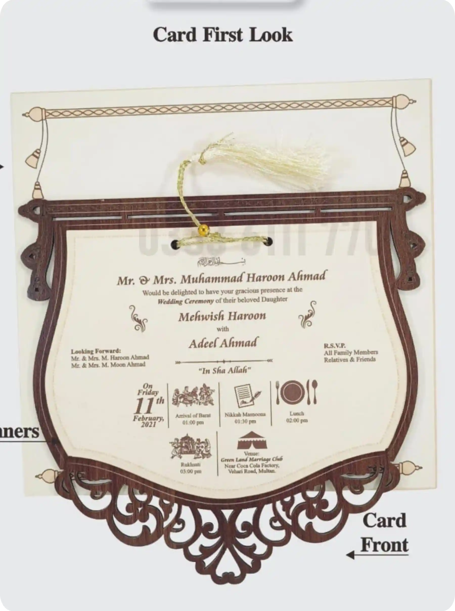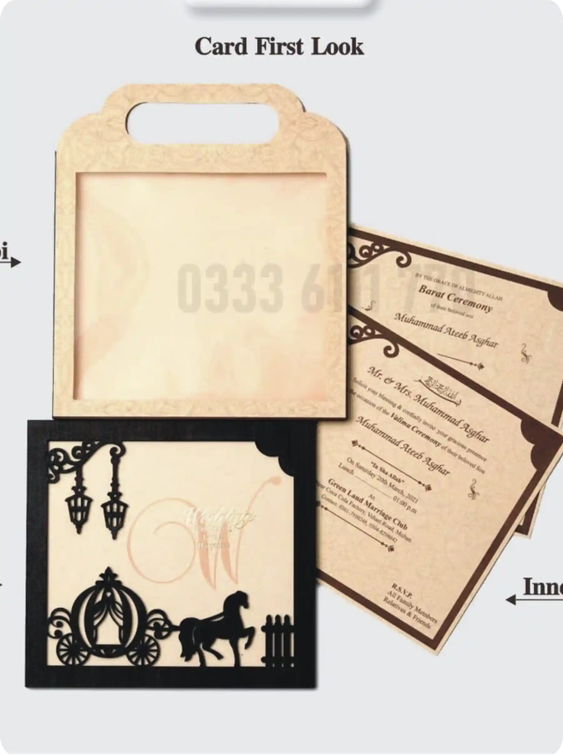 Laser Cut Wedding Cards Printing Services in Islamabad Pakistan & Rawalpindi City, Custom Laser Cut Wedding Card Online Print & Design Provider Company in Pakistan (PK) With Home Delivery Service By TCS & Bikea With Extra Delivery Charges, Best and High Quality Wooden Wedding Card Printing Service Available Online For Wedding, Barat, Walima & Mehndi, Contact on Whatsapp and Get Free Design with Every Wedding Card Order. Delivery Available For Karachi, Lahore, Quetta, Peshawar, Rawalpindi & Islamabad.